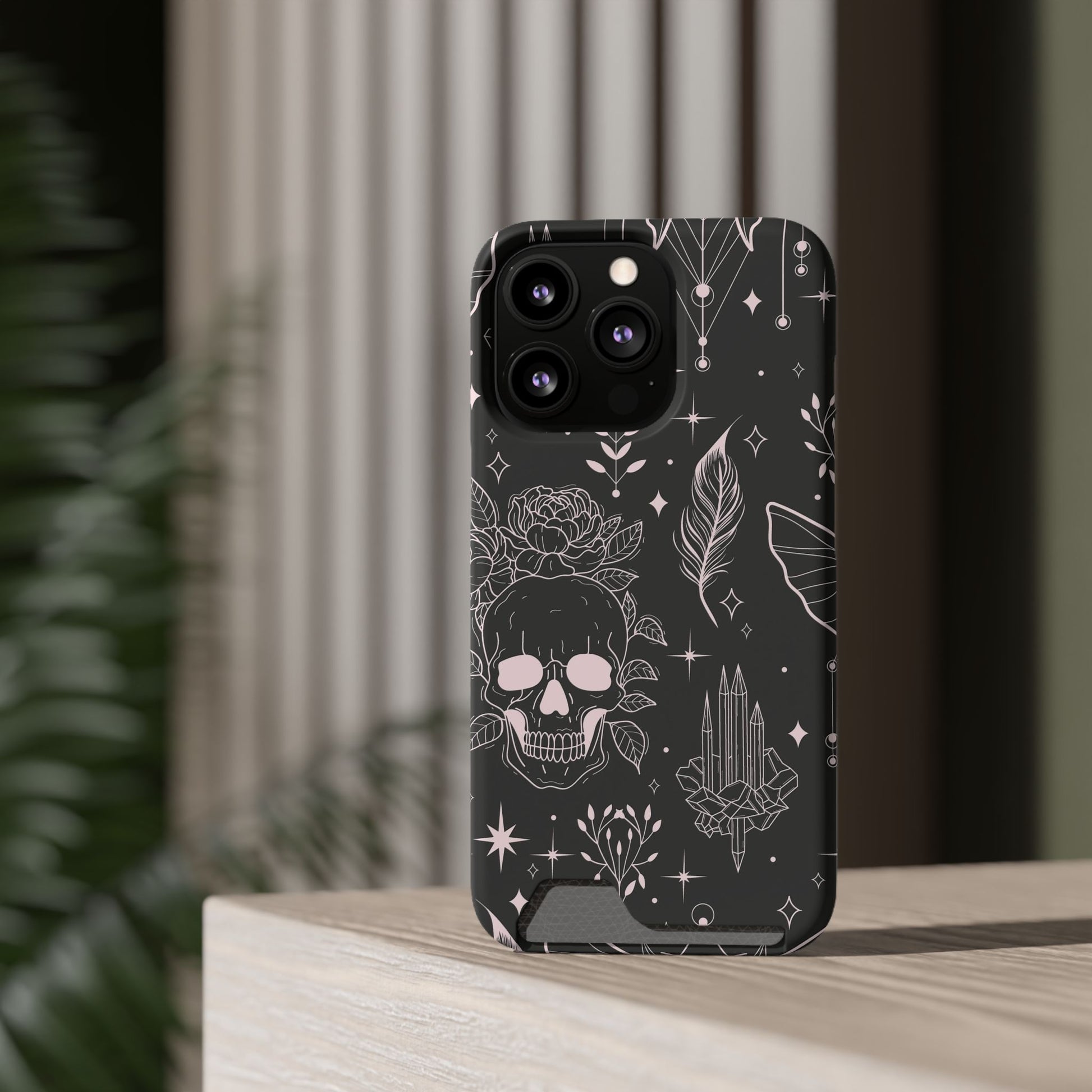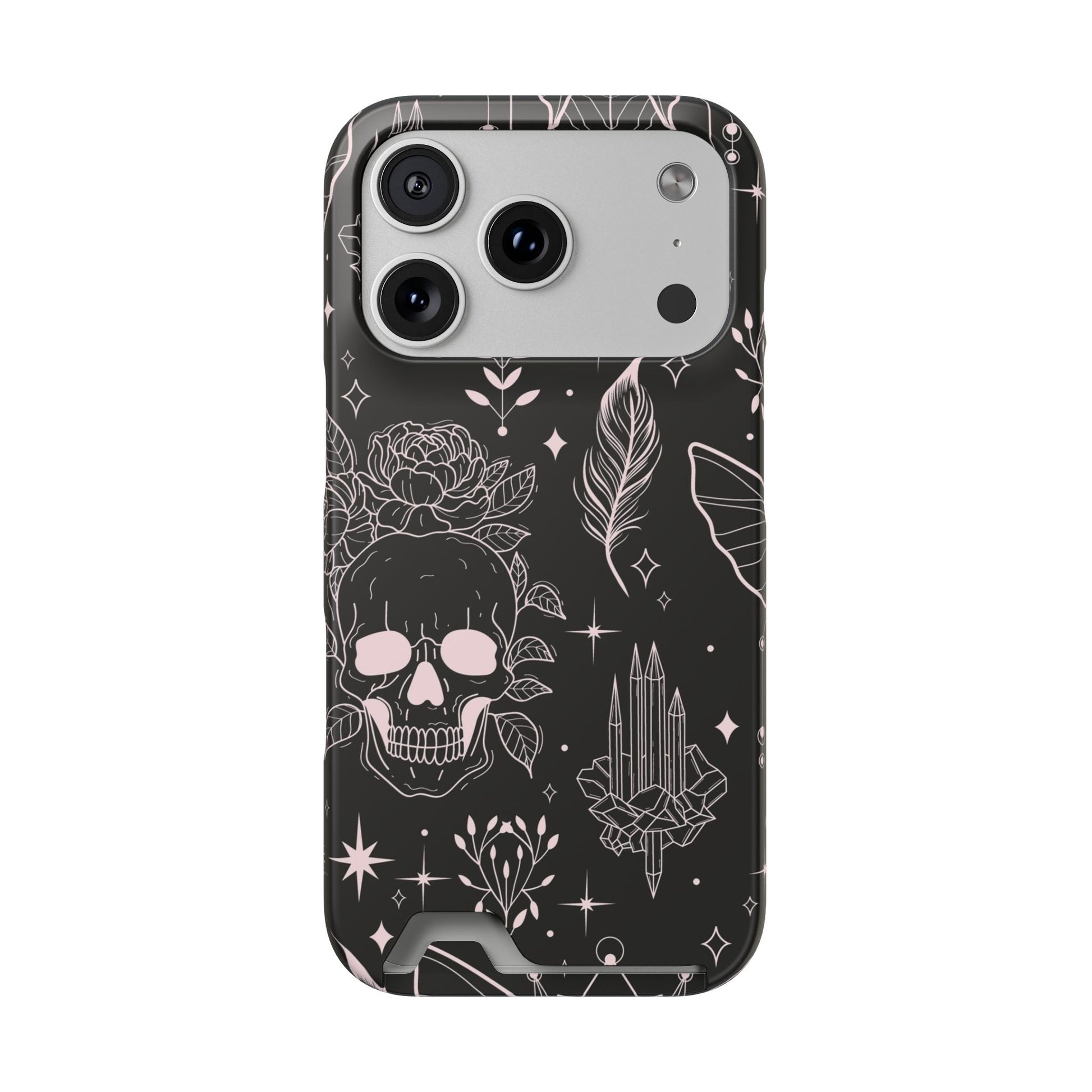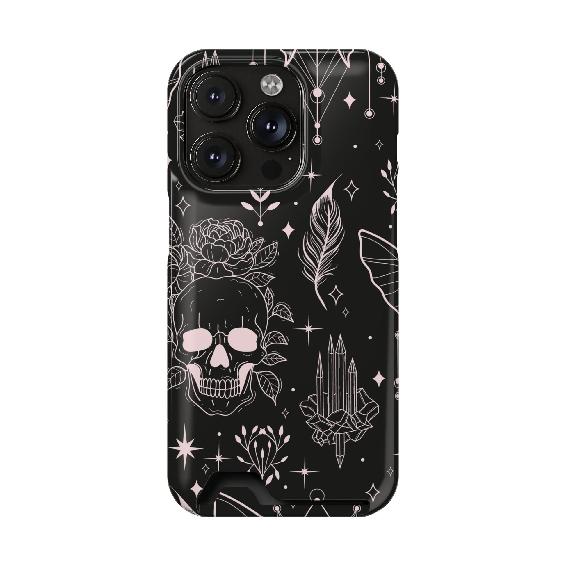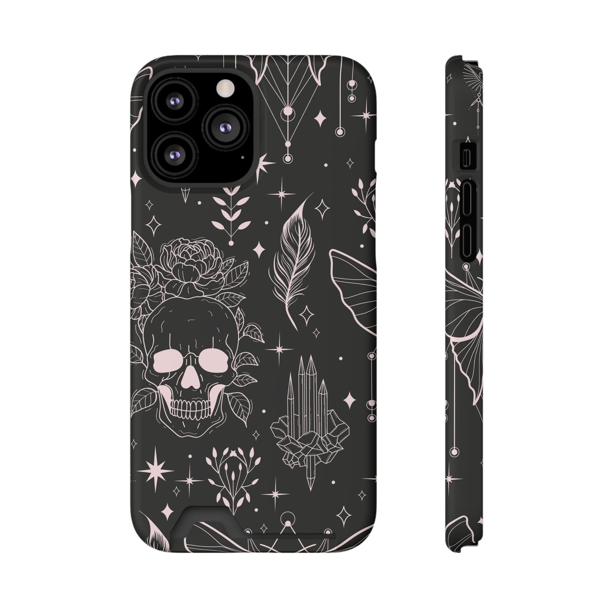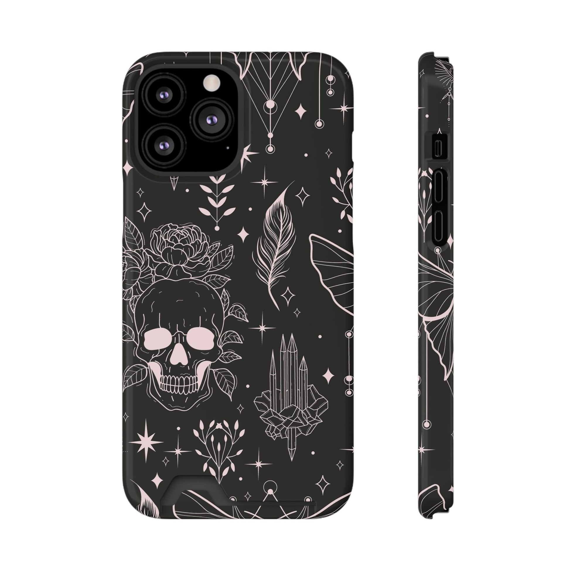 Mystic Skull Dark Aesthetic Phone Case with Card Holder — Gothic Crystal & Feather Design Luxury Cover