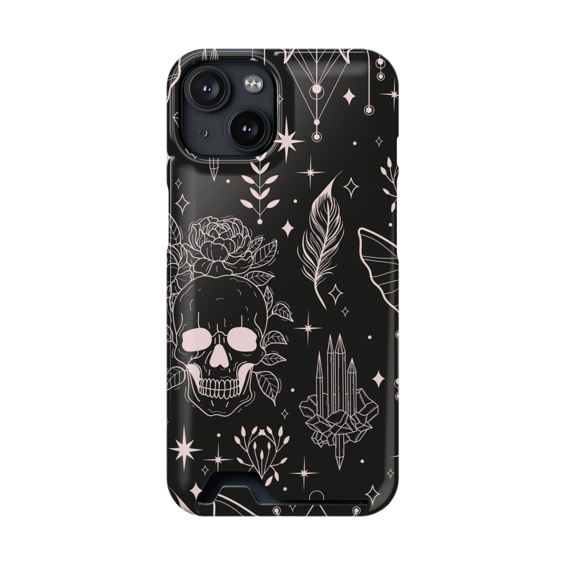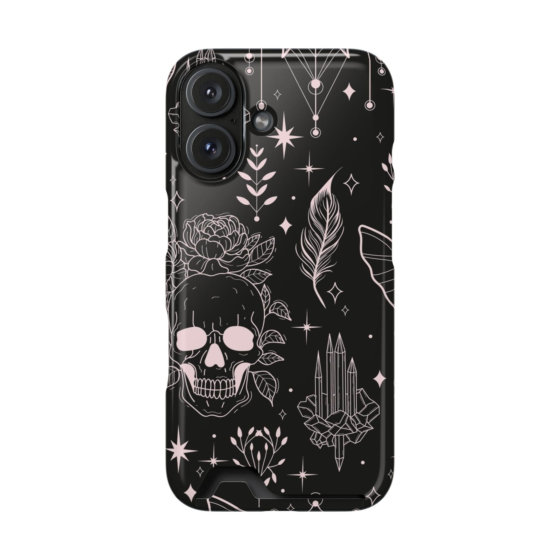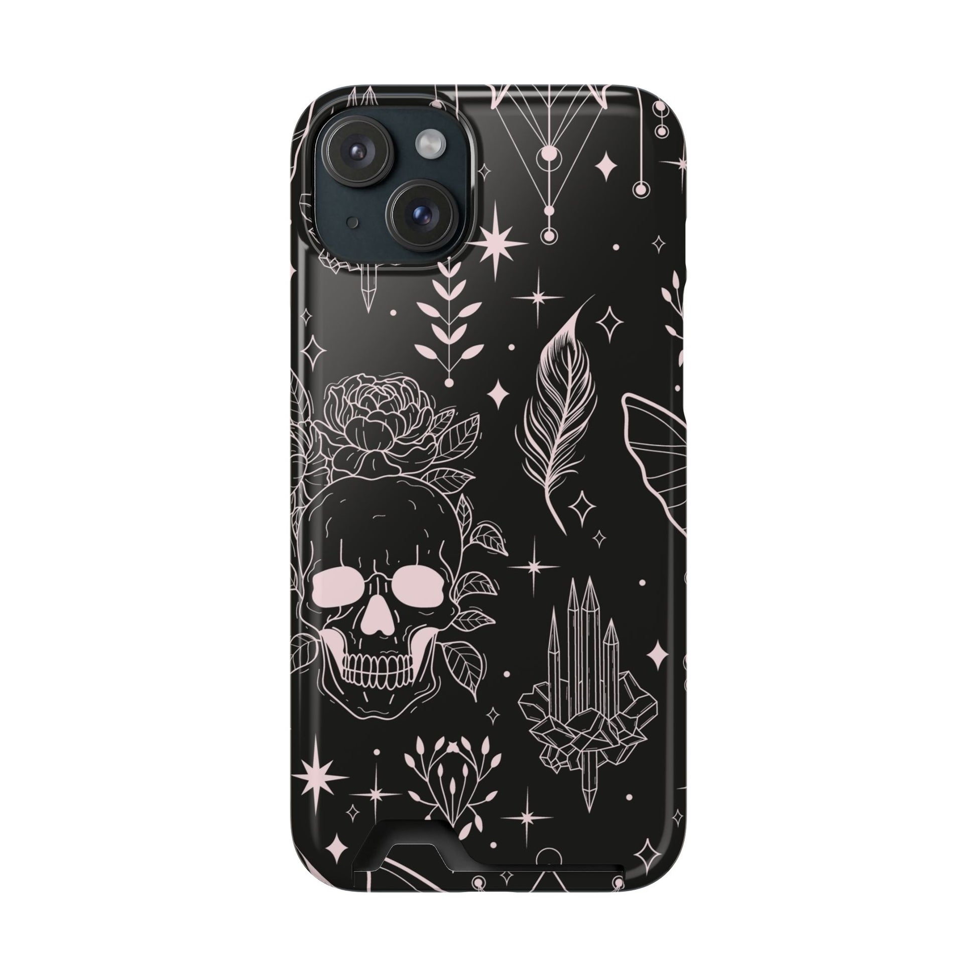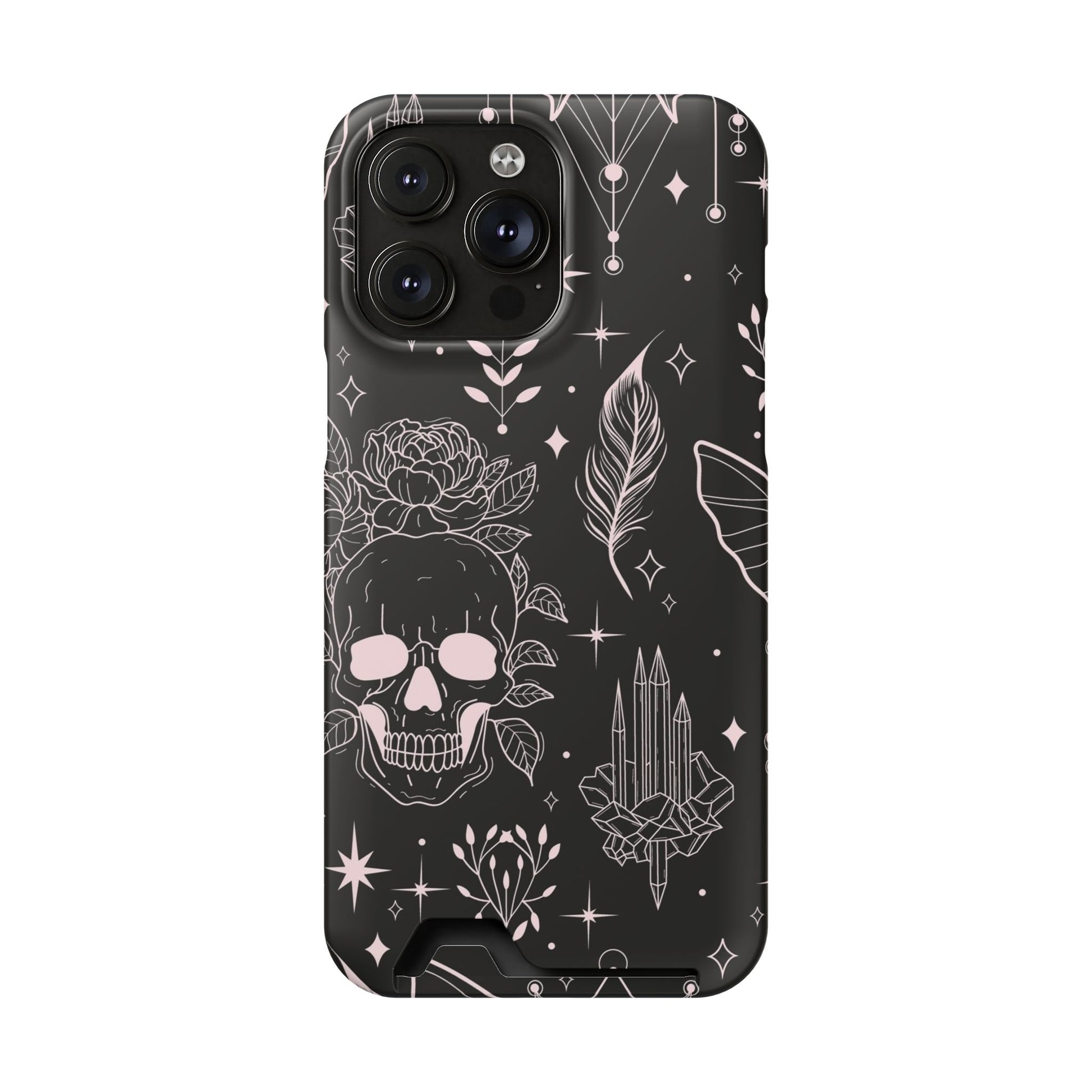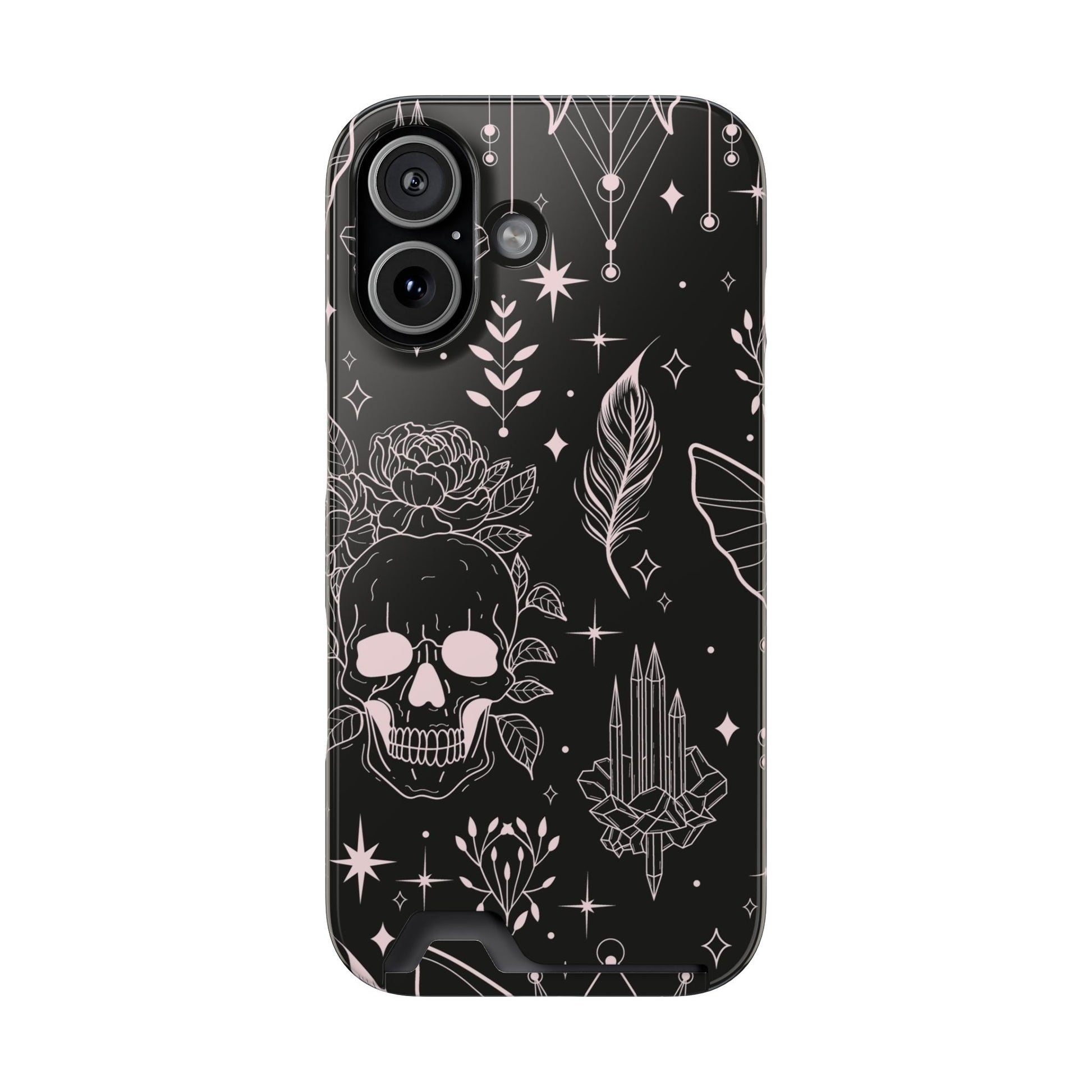 Mystic Skull Dark Aesthetic Phone Case with Card Holder — Gothic Crystal & Feather Design Luxury Cover