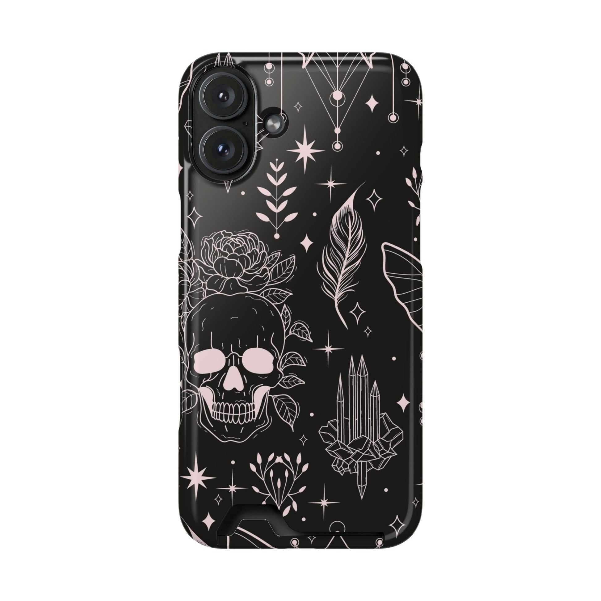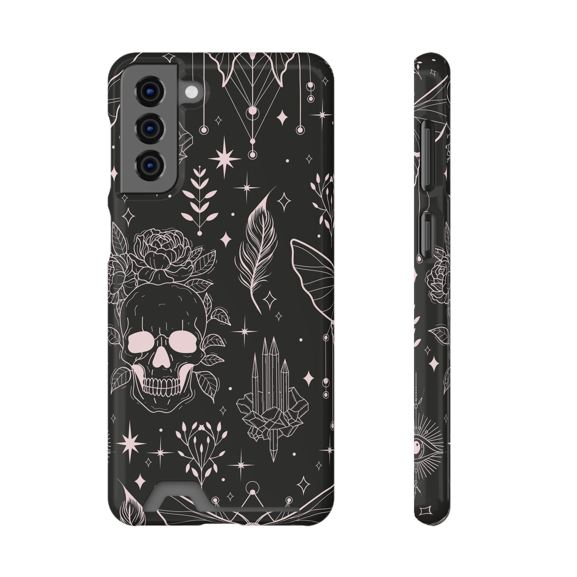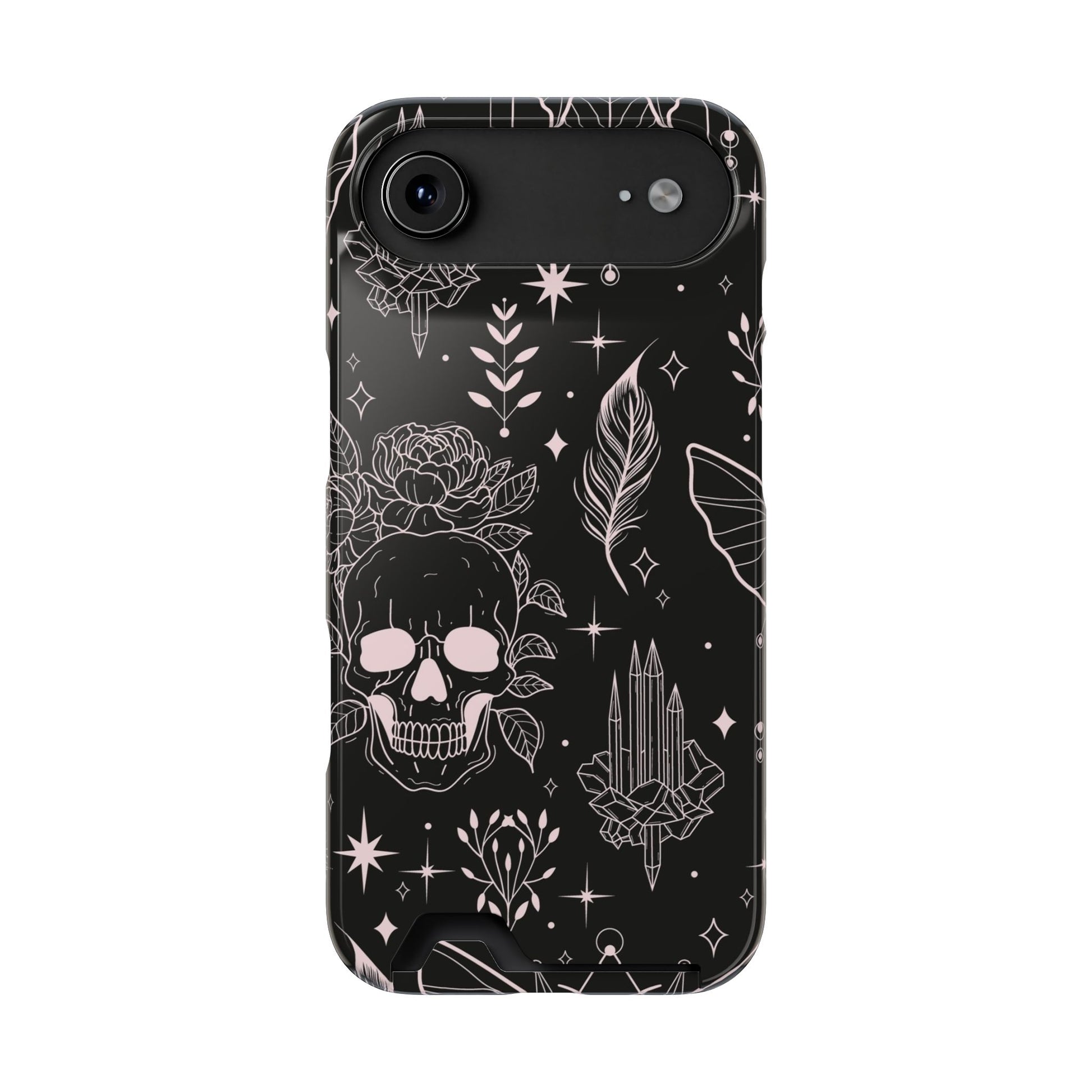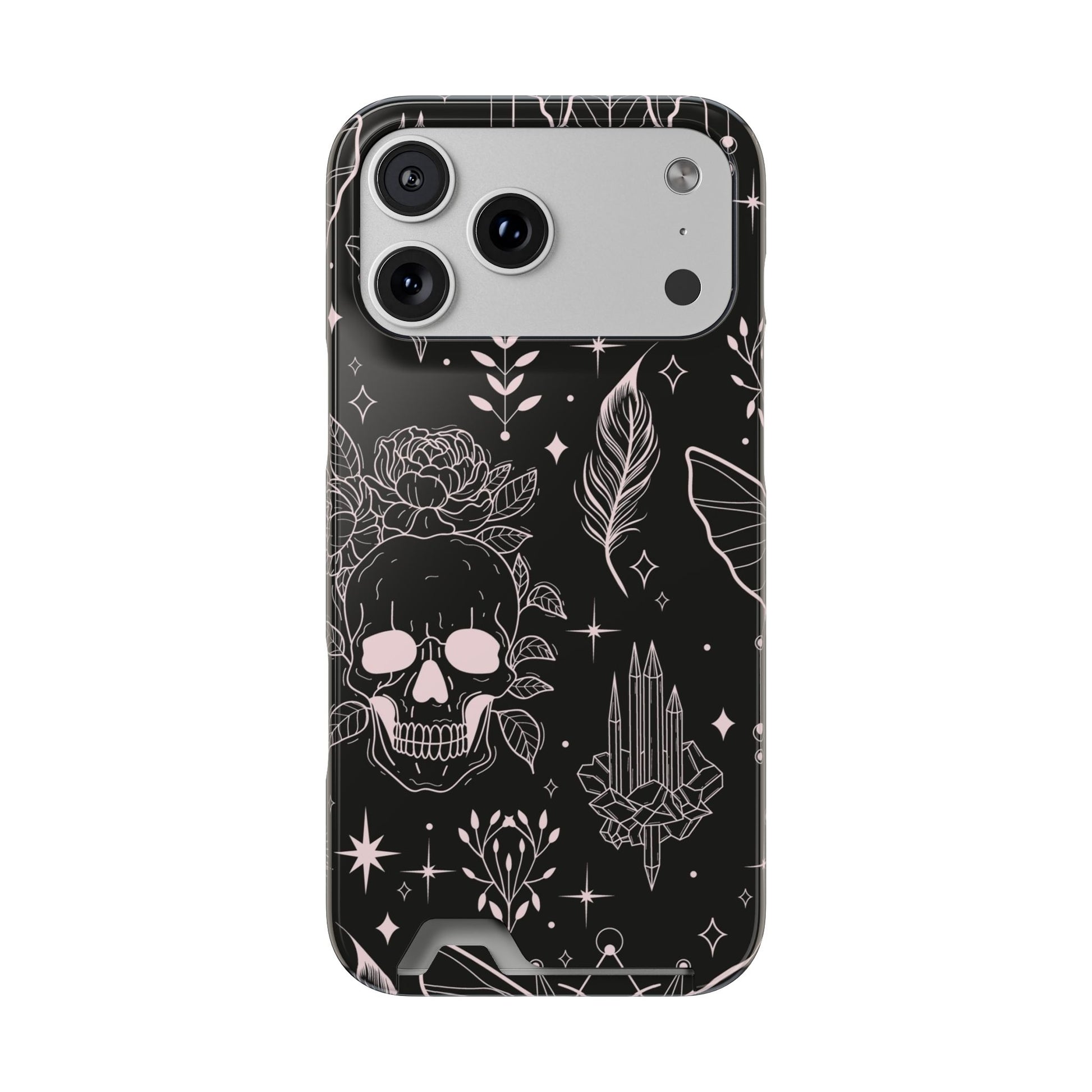 Mystic Skull Dark Aesthetic Phone Case with Card Holder — Gothic Crystal & Feather Design Luxury Cover