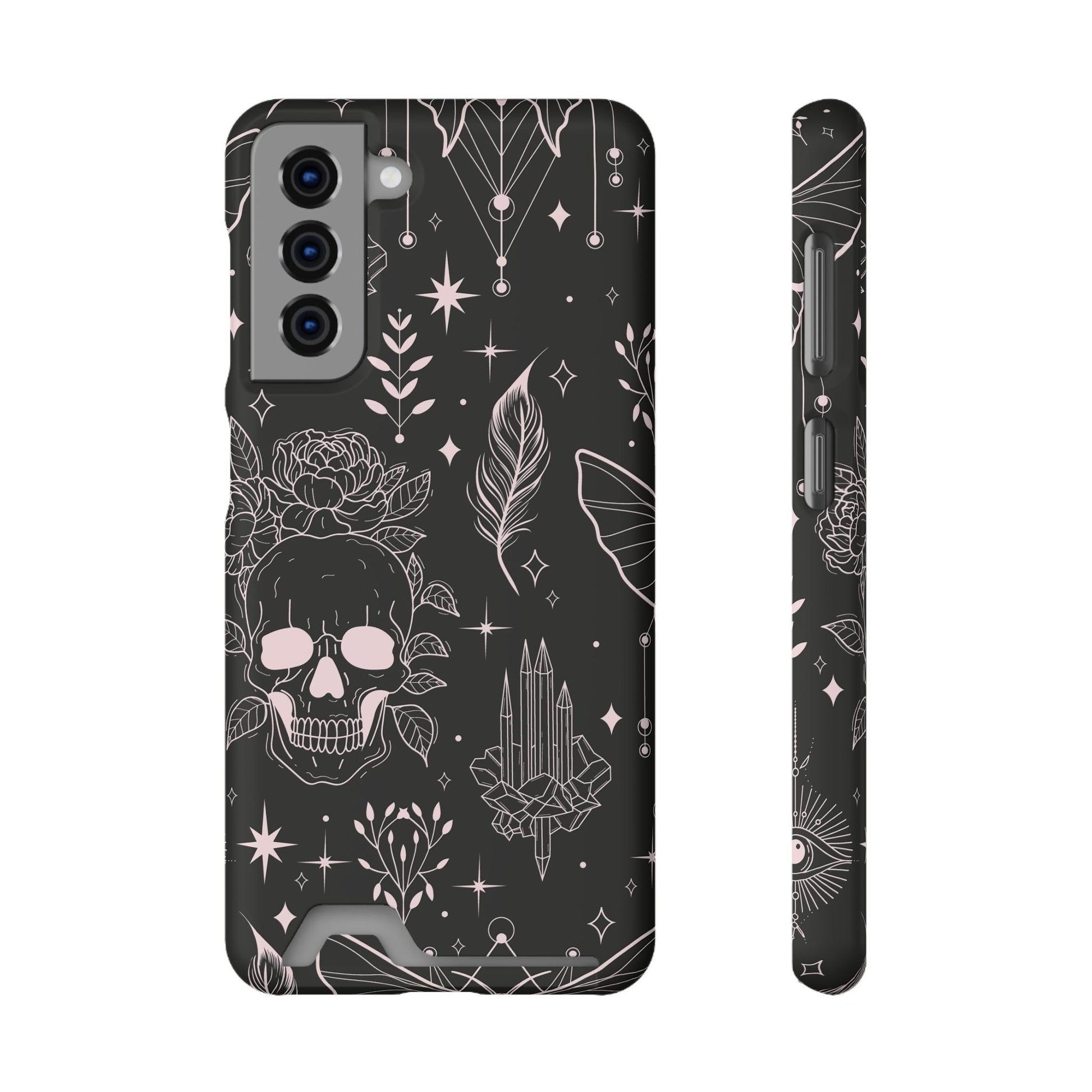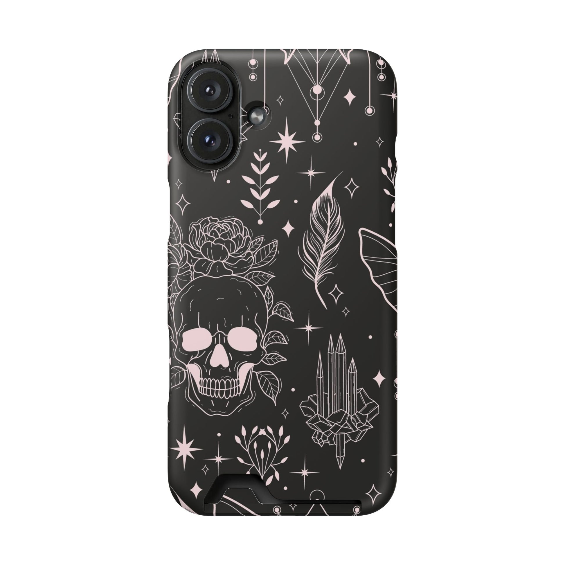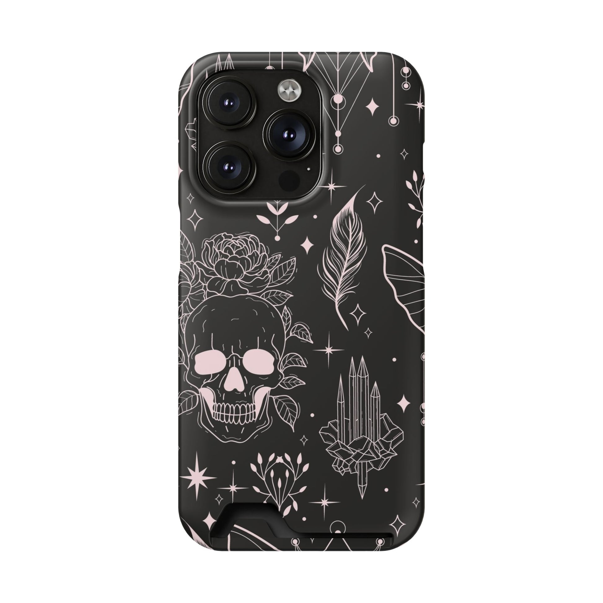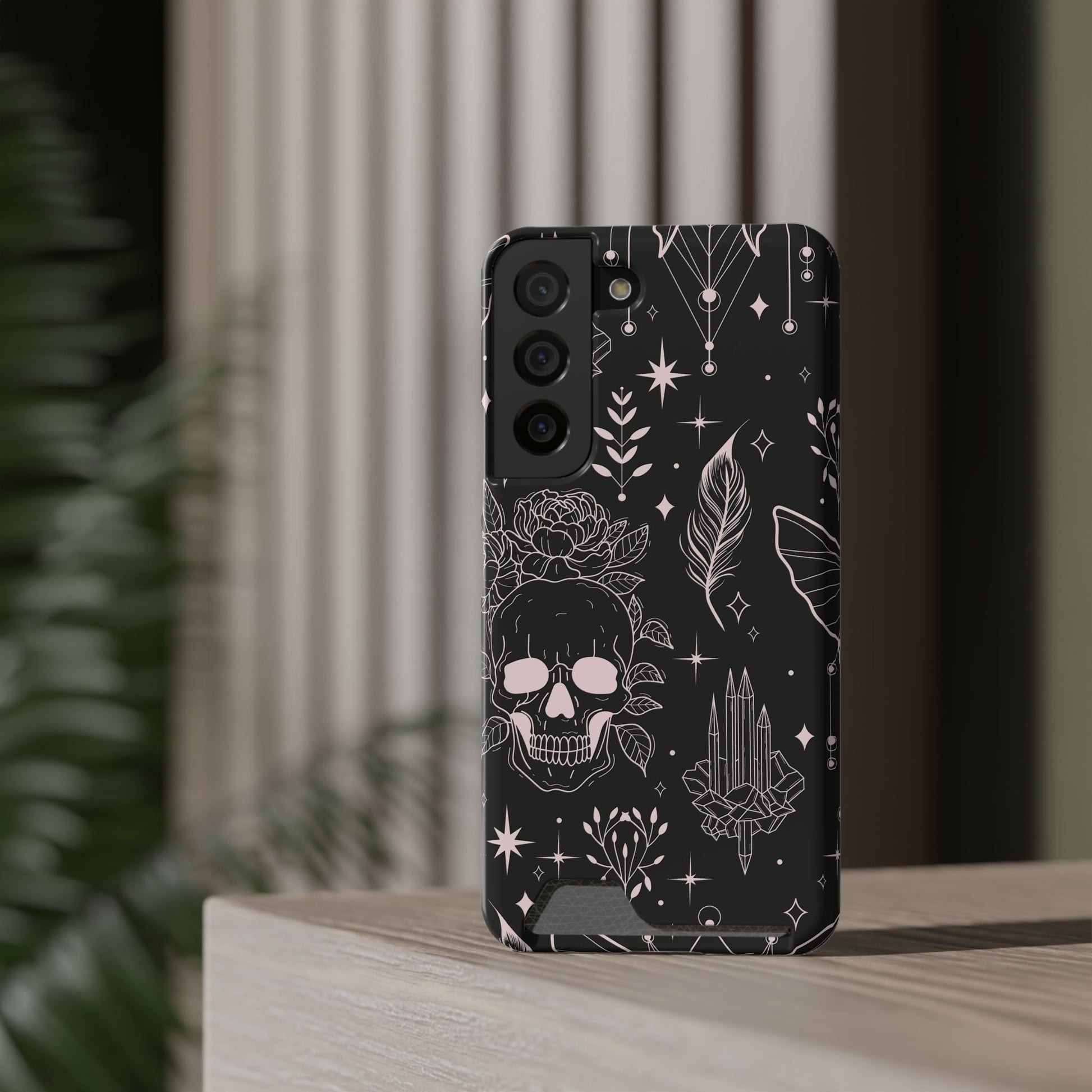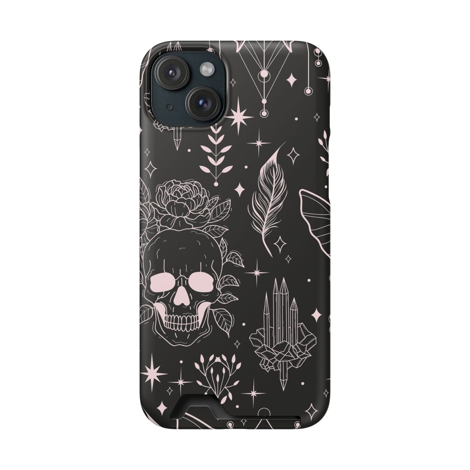 Mystic Skull Dark Aesthetic Phone Case with Card Holder — Gothic Crystal & Feather Design Luxury Cover