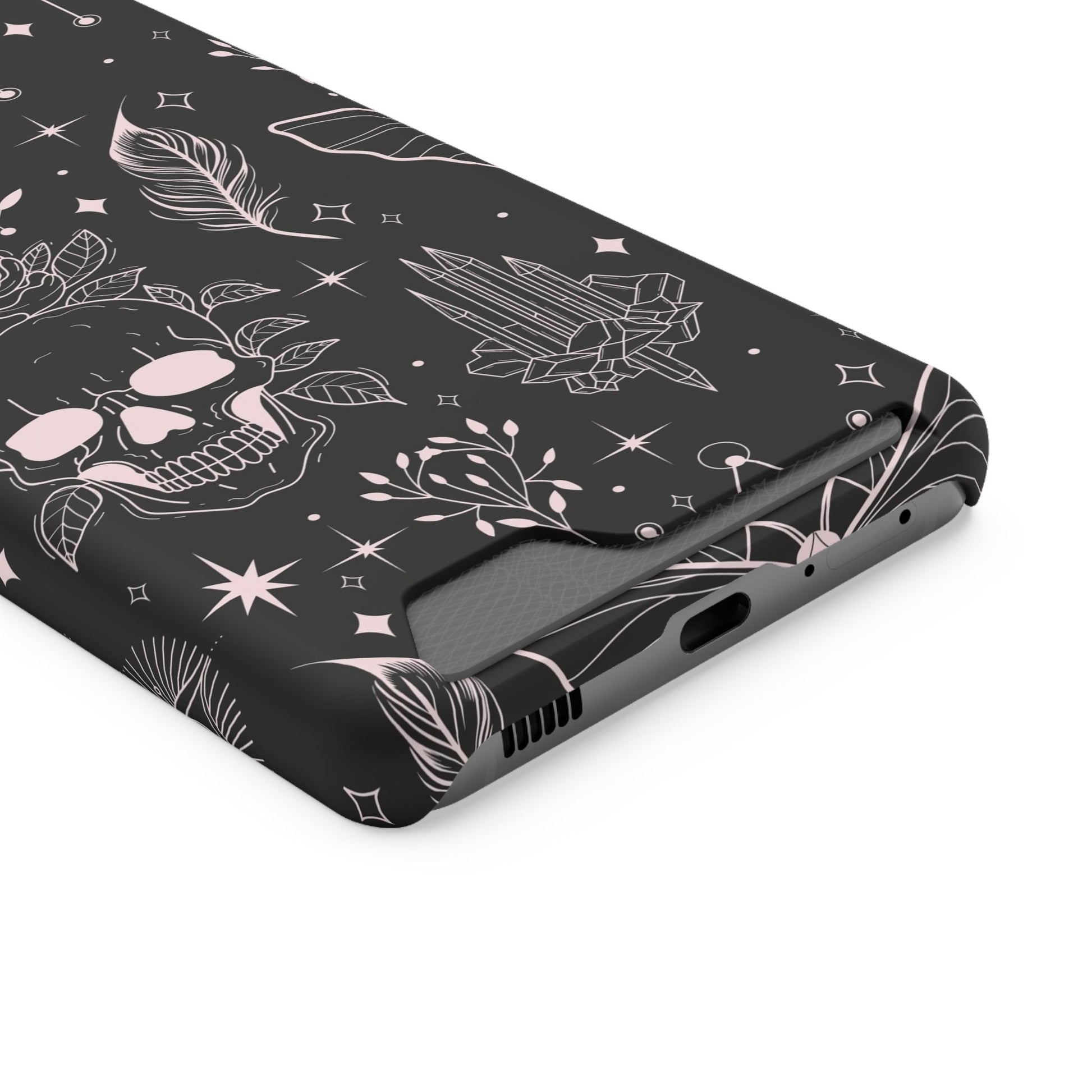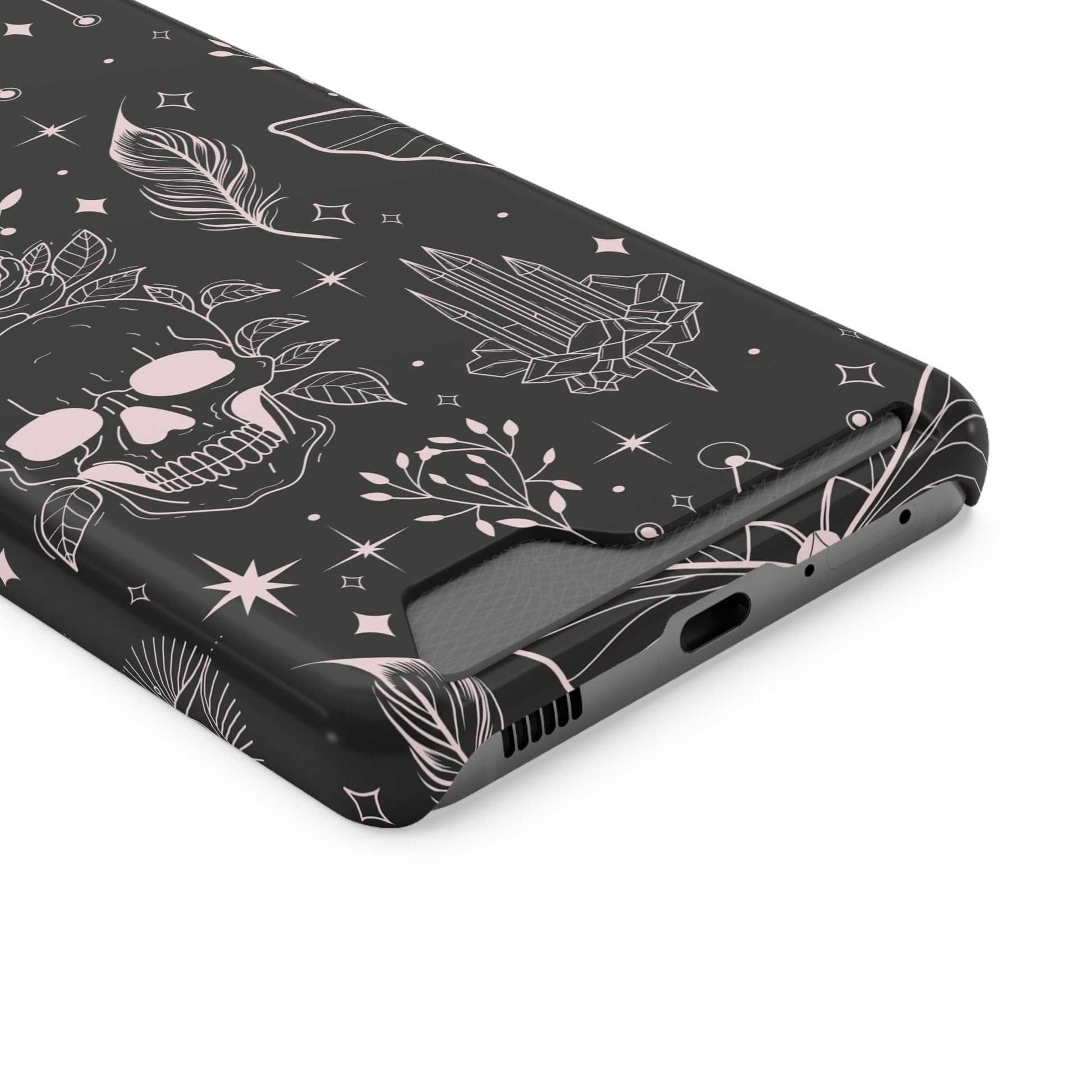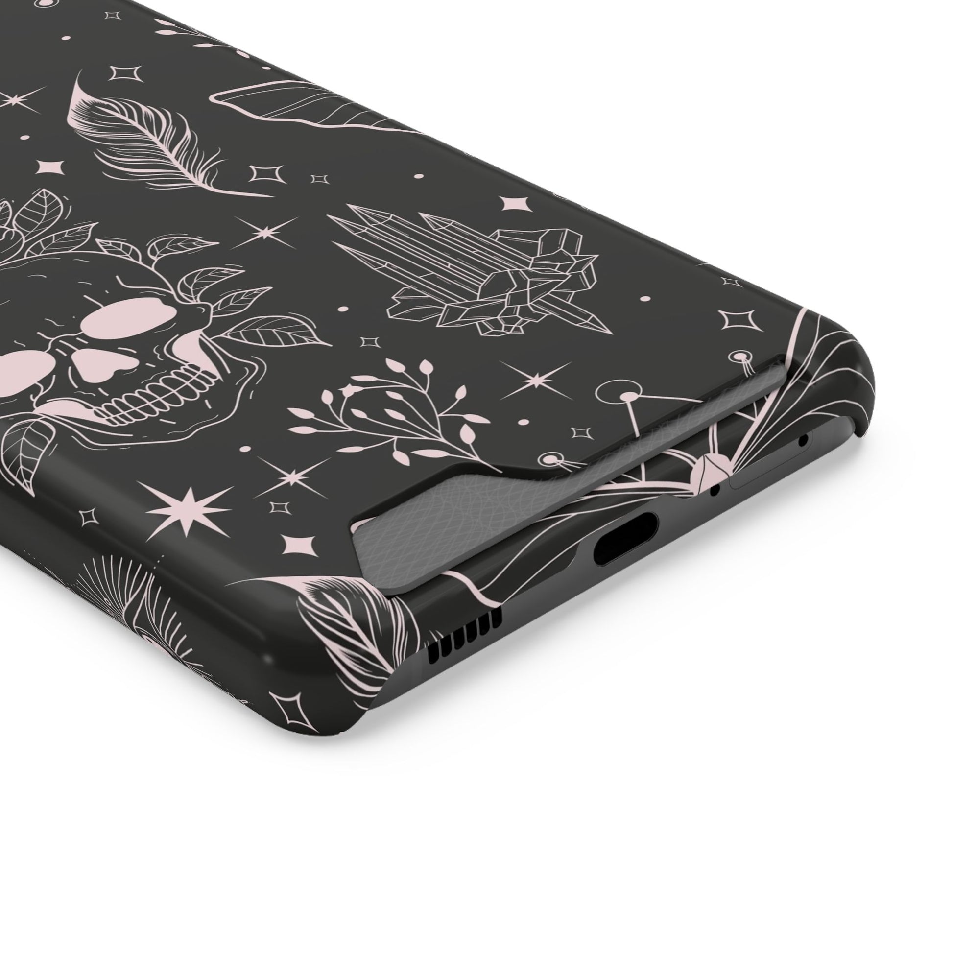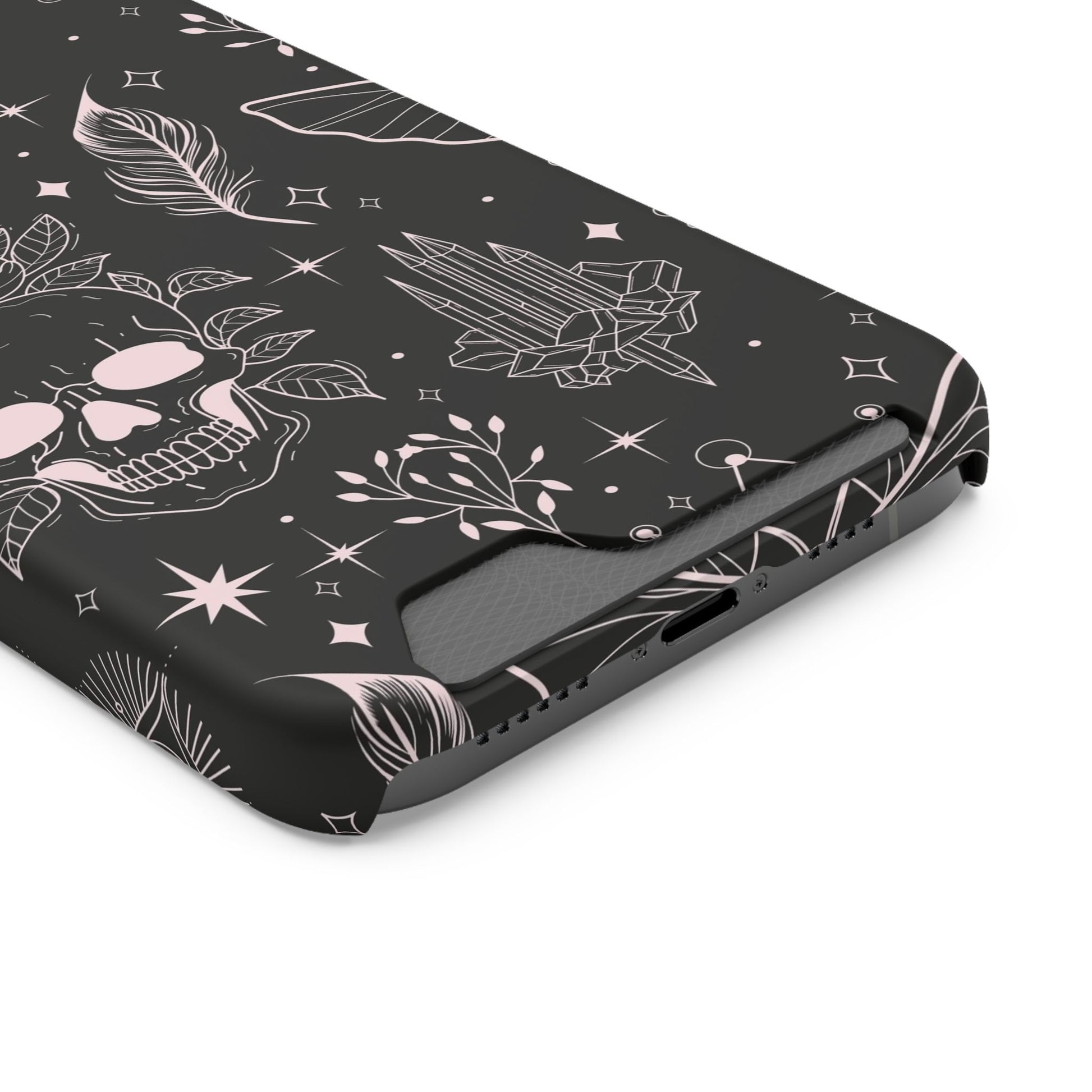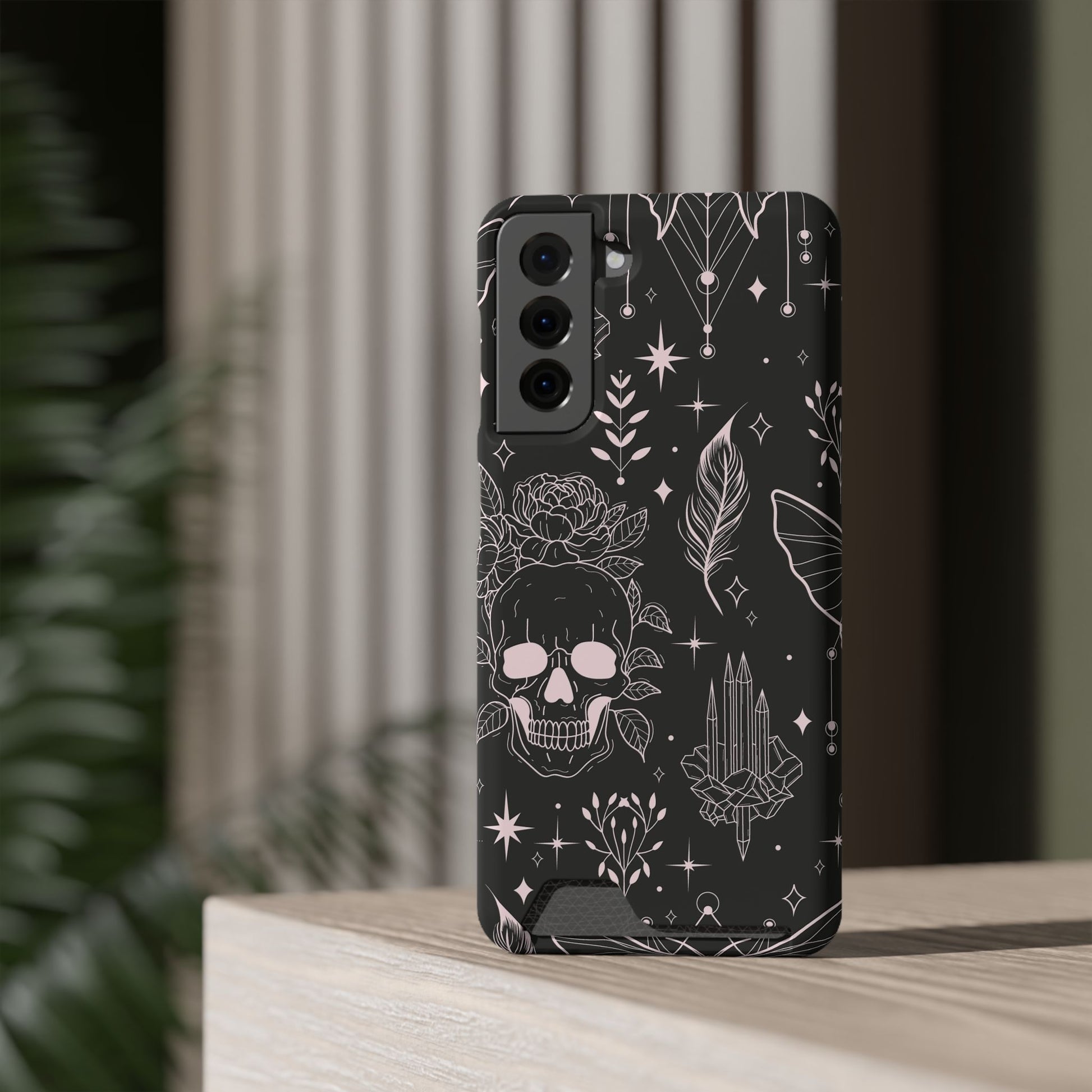 Mystic Skull Dark Aesthetic Phone Case with Card Holder — Gothic Crystal & Feather Design Luxury Cover